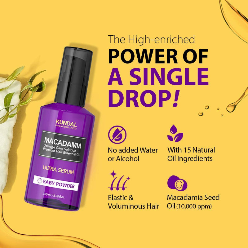 The KUNDAL Macadamia Ultra Hair Serum is a pure highly concentrated serum that does not contain water or alcohol. KUNDAL's Macadamia Ultra Hair Serum contains 10,000 ppm of macadamia and 15 natural plant-derived oils (Argan Oil, Macadamia Seed Oil, Avocado Oil, Coconut Oil and more!) to moisturize and nourish dull, brittle, and dry hair.
