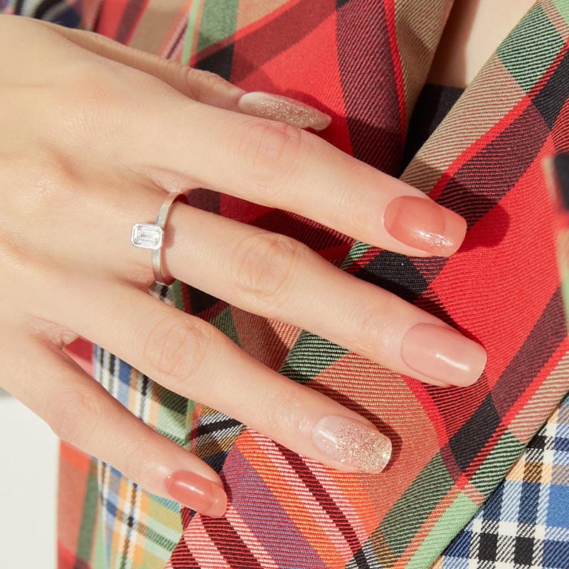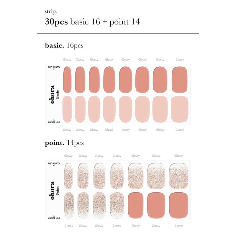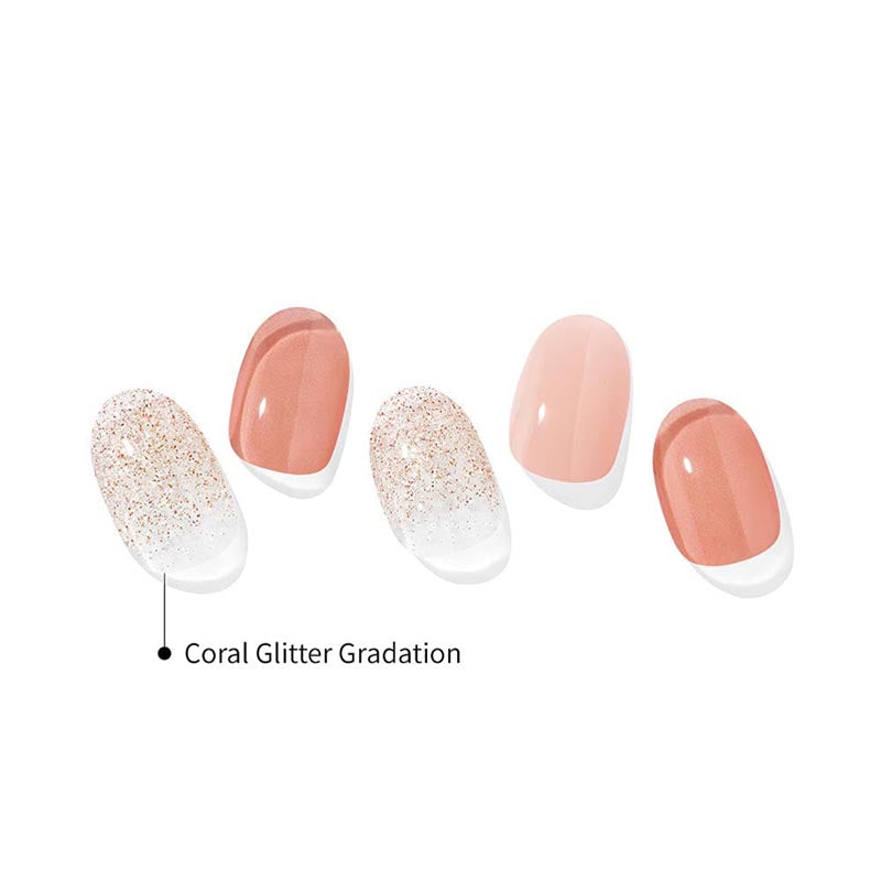 Elevate your look with a stunning multi-colored nude manicure! Combining coral and peach gel with a radiant rose-gold glitter ombré.