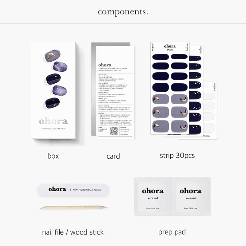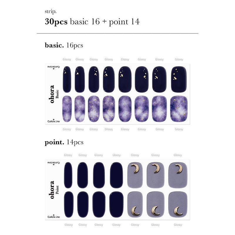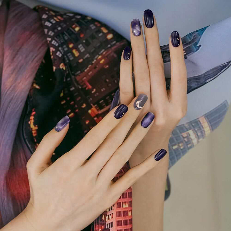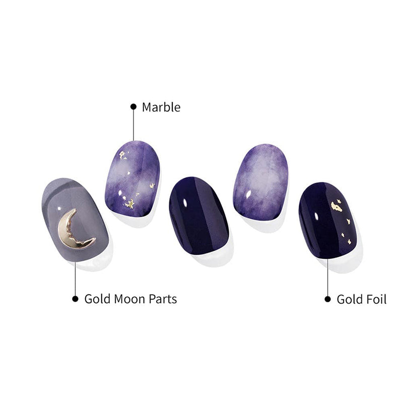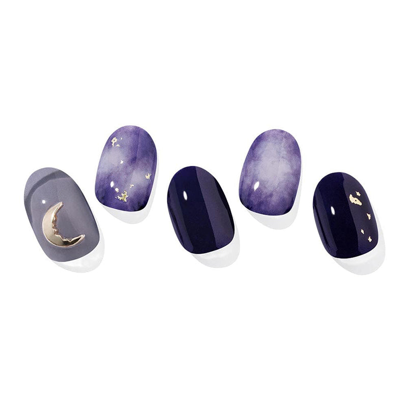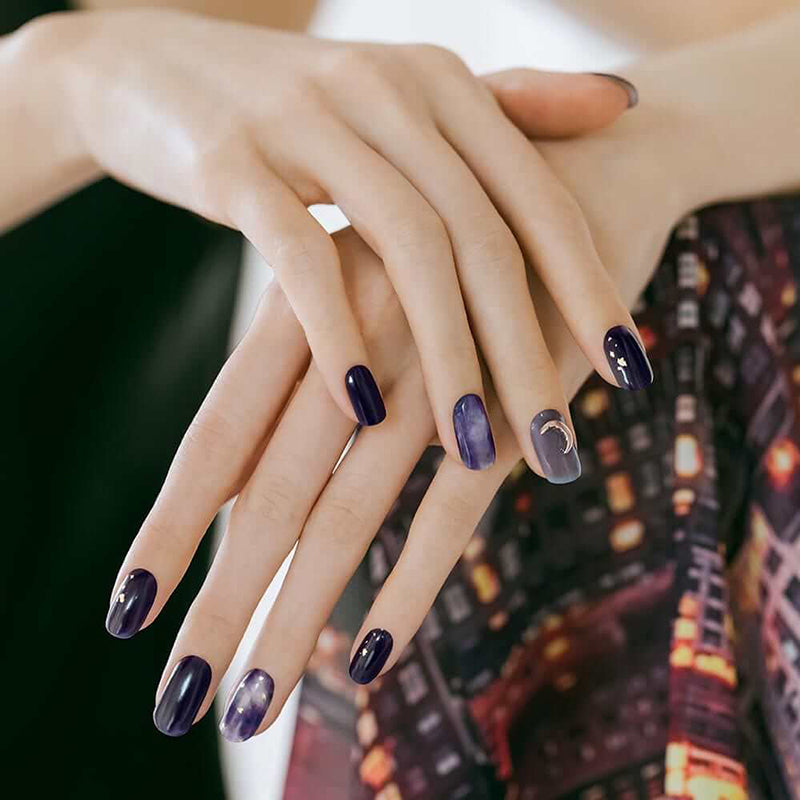 Capturing the essence of a celestial eclipse, this gel manicure features cloudy blue and purple marbling, intricate gold flakes, and a crescent-moon shaped decal, creating a hauntingly beautiful design inspired by the night sky.