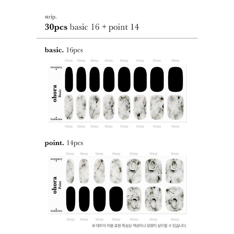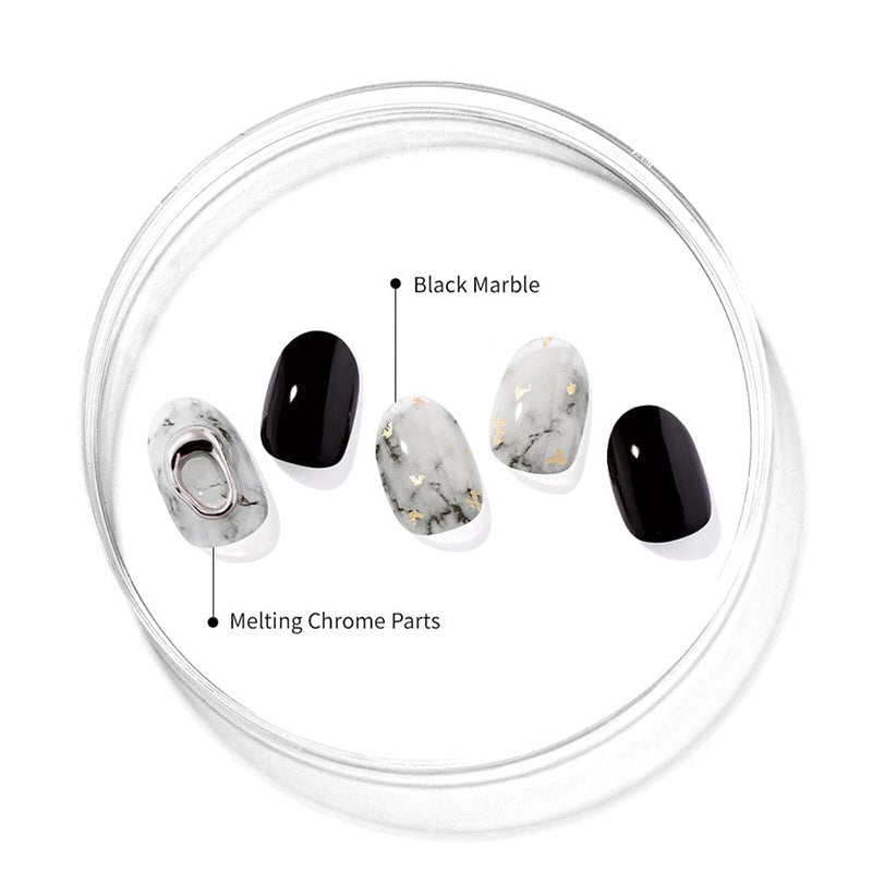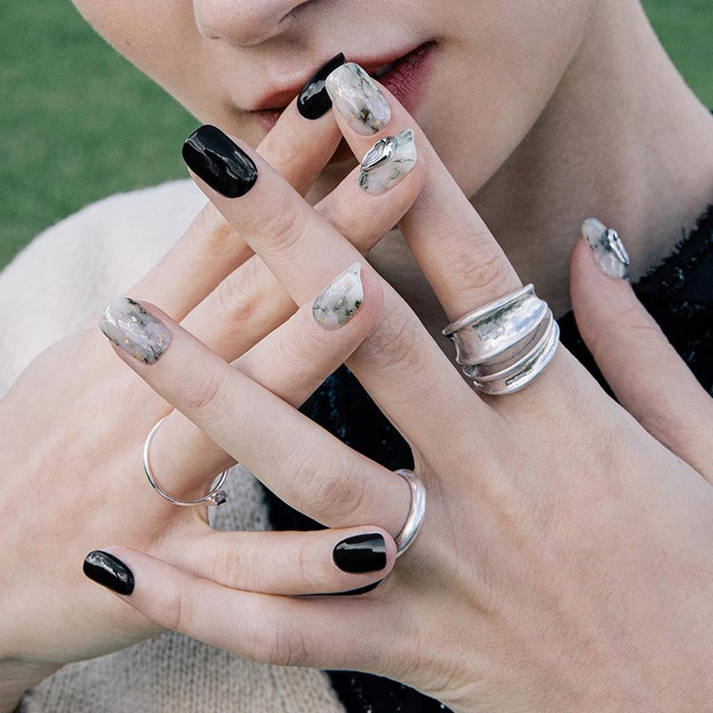 Indulge in luxury with this mesmerizing premium manicure. Featuring ink black gel, sensual marbling, and a melted silver chrome piece for an exquisite finish.