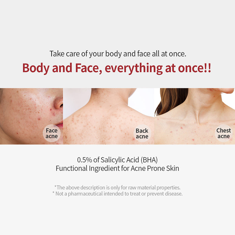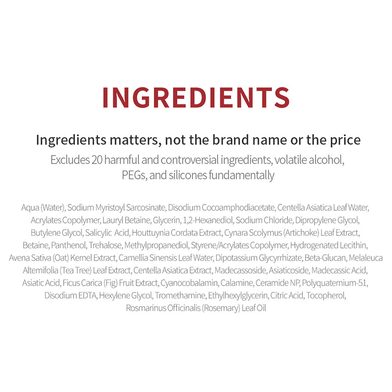 Water, Sodium Myristoyl Sarcosinate, Disodium Cocoamphodiacetate, Centella Asiatica Leaf Water, Acrylates Copolymer, Lauryl Betaine, Glycerin, 1,2-Hexanediol, Sodium Chloride, Dipropylene Glycol, Butylene Glycol, Salicylic Acid, Houttuynia Cordata Extract, Cynara Scolymus Leaf Extract, Betaine, Panthenol, Trehalose, Methylpropanediol, Styrene/Acrylates Copolymer, Hydrogenated Lecithin, Avena Sativa Kernel Extract, Camellia Sinensis Leaf Water, Dipotassium Glycyrrhizate, Beta-Glucan, Melaleuca Alternifolia Leaf Extract, Centella Asiatica Extract, Madecassoside, Asiaticoside, Madecassic Acid, Asiatic Acid, Ficus Carica Fruit Extract, Cyanocobalamin, Calamine, Ceramide, Polyquaternium-51, Disodium EDTA, Hexylene Glycol, Tromethamine, Ethylhexylglycerin, Citric Acid, Tocopherol, Rosmarinus Officinalis Leaf Oil
