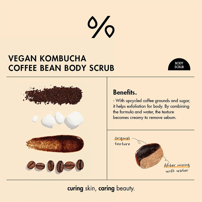 The Dr.Ceuracle Vegan Kombucha Coffee Bean Body Scrub is a body scrub with recycled coffee beans and kombucha. The creamy consistency of microbubbles is created when the formula is mixed with water, which effectively removes dirt and gently exfoliates. Contains 20% Kombucha Tea extract (which is rich in probiotics) and vitamin B (which helps to release toxins and strengthens your skin’s immunity). A low pH value gently removes dirt and oil without drying out.